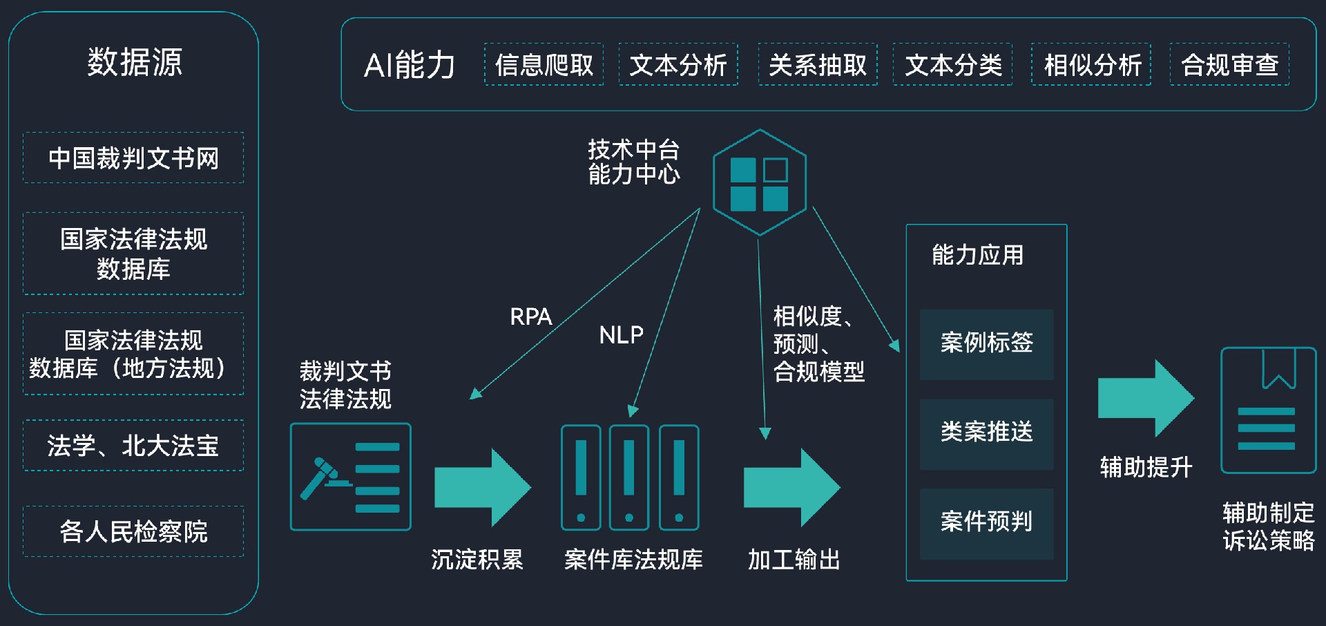 智能案件管理是智慧法务管理平台的智慧化应用方案,它基于裁判文书、行业案例数据、法律法规等大数据,开发了信息抽取、文本分析、文本分类、相似分析等AI能力,实现案例标签、案件预测、类案推送等应用,将AI技术应用于法务案件收案、办案、结案全过程,协助律师制定诉讼和辩护策略,提高案件管理效率、为最大限度维护自身合法权益提供智能辅助。