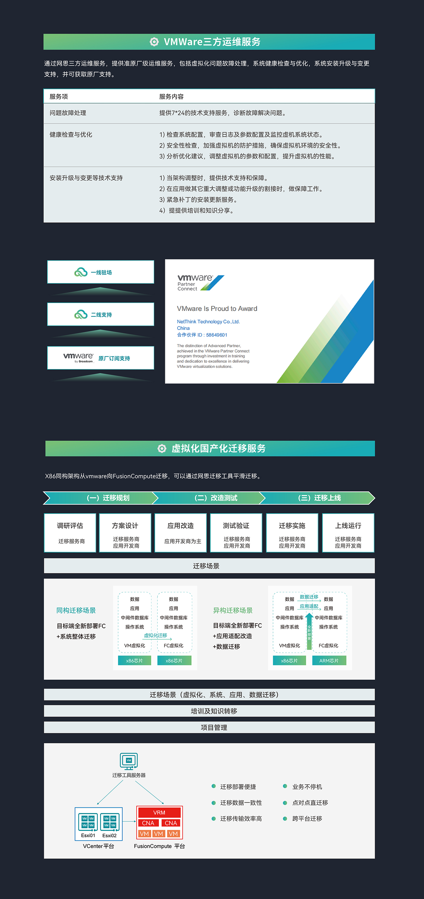 网思科技作为VMWare产品服务授权代理商和服务商,具有专业的服务团队、服务方案和服务经验,提供VMware三方运维和国产化迁移替代服务。